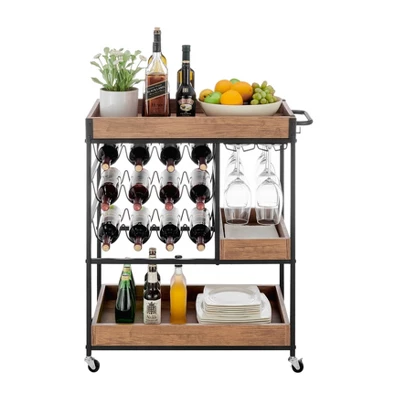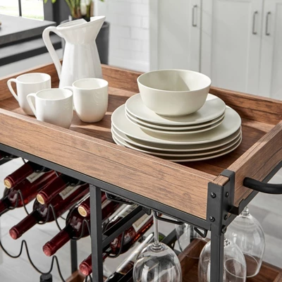 - Combines industrial metal hardware and accents with warm farmhouse walnut wood tone trays to achieve a rustic and charming style for this wine bar cart