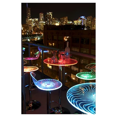 The Spyra Bar Table adds a colorful twist to your party with a glowing table top! It features a clear acrylic top with visibly etched swirls when both on and off. The Spyra Bar Table is supported by a chrome base and pole. Once the multi-colored LEDs hidden in the bar table are turned on and start to phase between red, blue and green, the table top glows for a fantastic look! The Spyra Bar Table includes a power adapter. On a full charge it can last up to 8 hours.