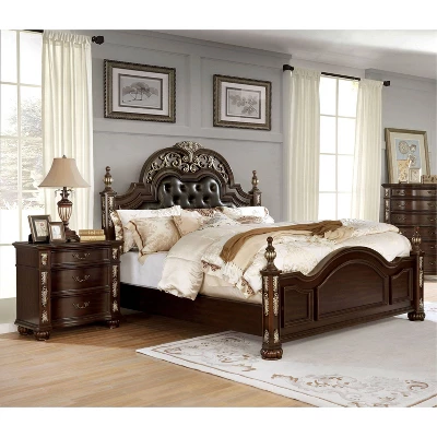 Traditional style is romanticized on this classic brown cherry two-piece bedroom set. This Victorian-inspired set sits on ornate scalloped bun feet. The padded button-tufted faux leather upholstered headboard adds depth to the frame. Acanthus leaf details embellish the four bedposts to match that of the nightstand. The bedside table is embellished with classic drop handles, while also offering modern USB ports.