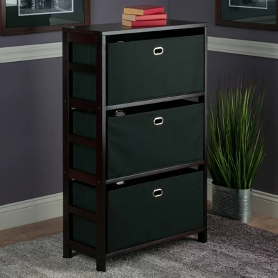 Whether you’re stowing gloves and shoes in the entryway, organizing toys in the kids’ rooms, or need a place for sweaters or towels, the Torino 4-Piece Shelf unit provides handsome and effortless storage. The 3-Tier open shelf is made of Solid Wood for long-lasting durability. The foldable baskets are constructed of sturdy fiberboard with Chocolate fabric. Carrying them is easy and secure with metal ring handles. This versatile shelf, finished in Espresso, offers stylish organization for all your essentials.