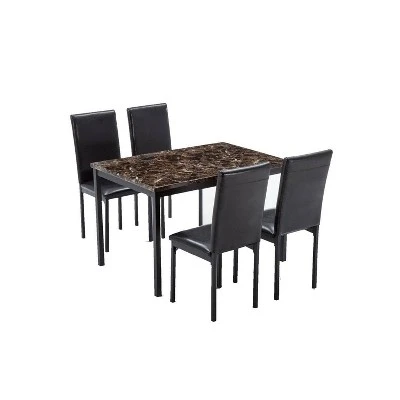 The Arjen 5-Piece Dining Set is brimming with easygoing transitional style. This five-piece set replicates the look of a much pricier set at an affordable price. The rectangular faux marble dining table comes with four faux leather chairs, providing easy seating for four. The tabletop’s faux marble look is created with MDF covered in durable paper laminate. Choose between the black or the brown leatherette upholstery. And for a counter height dining option, look for the Arjen 5-Piece Counter Height Dining Set (sold separately).
