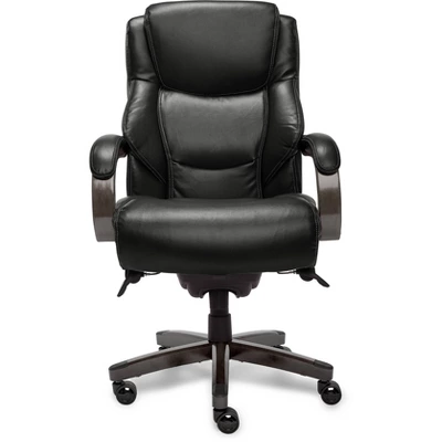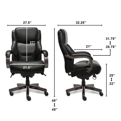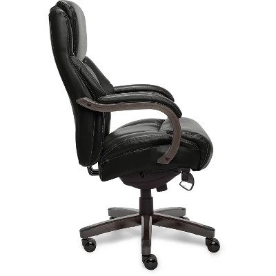 The La-Z-Boy Delano is a Big and Tall high back Executive Office chair designed to bring premium comfort and support to your home or office. Upholstered in soft bonded leather with hand-sculpted real wood arms and base, this desk chair creates an elegant blend of traditional style and modern performance that will lift any office, home or entertainment space. This comfortable office chair has a contoured back lumbar panel and an advanced Memory Foam cushion layering system to give comfort and support in the areas you need it most. Ergonomic and adjustable, this La-Z-Boy office chair allows you to control the height, tilt and lift to suit your sit positioning and give you an optimized body alignment.