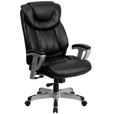 Finding a comfortable chair is essential when sitting for long periods at a time. Big & Tall office chairs are designed to accommodate larger and taller body types. This chair has been tested to hold a capacity of up to 400 lbs., offering a broader seat and back width. Upholstered in supple LeatherSoft upholstery, this chair will add an upscale look to your workspace. LeatherSoft is leather and polyurethane for softness and durability. The tilt lock mechanism rocks/tilts the chair and locks in an upright position while the tilt tension adjustment knob adjusts the chair’s backward tilt resistance. High back office chairs have backs extending to the upper back for greater support. The high back design relieves tension in the lower back, preventing long term strain. This office chair features plenty of thick, plush padding to provide greater support. Chair easily swivels 360 degrees to get the maximum use of your workspace. The pneumatic adjustment lever will allow you to easily adjust the seat to your desired height. The height and width adjustable padded armrests take the pressure off the shoulders and the neck. The silver nylon capped metal base with black caps prevents feet from slipping.