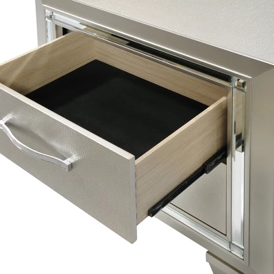 The Picket House Furnishings Glamour Youth Nightstand glams up your bedroom. This bedroom staple comes with two, spacious drawers. Its chic champagne finish is accented by a decorative mirror trim throughout. Completing this fabulous look are sparkling, crystal and chrome handles to indulge your inner starlet. Add this nightstand to your home today for a look that you will love to come home to, day after day.