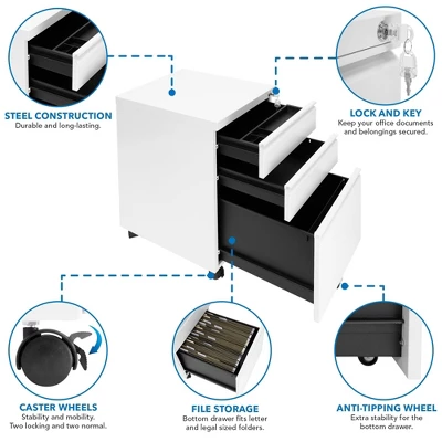 The Rolling Drawer Cabinet for Under Desk features intuitively designed drawers that meet all your home and office needs. We’ve designed our small file cabinet to fit neatly under your desk while optimizing storage. The top drawer provides easy to reach access to pens, papers, and other supplies. The second drawer in our mobile filing cabinet offers deeper storage space for larger items, while the bottom third drawer is designed to house legal-size hanging file folders.All necessary hardware is included.