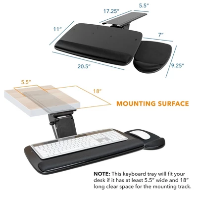 This under desk keyboard tray helps you save valuable desk space and improve ergonomics. The tray positions your keyboard and mouse lower and closer to your body, allowing you to adopt and maintain a neutral working posture. Height and tilt of the keyboard platform can be easily adjusted to your ideal setting by turning the knob. Correct wrist and typing posture is essential to preventing carpal tunnel syndrome. This keyboard tray comes with a soft gel wrist pad to reduce strain and support your wrists while typing and using the mouse. The mouse platform includes a pad with wrist rest which can be placed either on the left or right side of the keyboard tray. Save space by stowing the mouse and keyboard under the desk when not in use.Includes hardware for mounting to a desk.