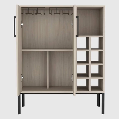 This bar cabinet keeps your wine and cocktail essentials organized in a rustic-inspired design. Store wine glasses and bottles the wide cubbies. Recipe books, barware, and other drink essentials rest in the cabinets. This cabinet will blend with any farmhouse or coastal decor, giving the piece a cohesive look on your countertop.
