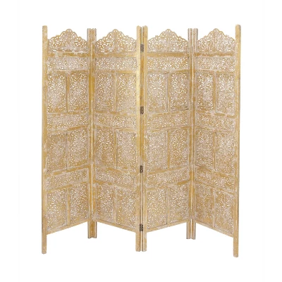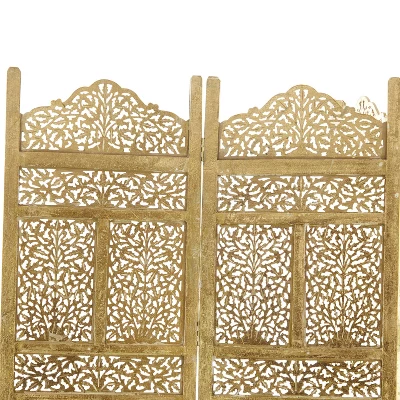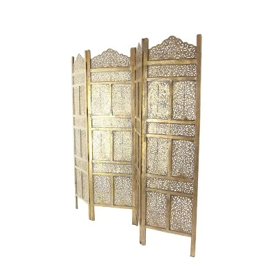Add beauty and depth to your endearing living spaces as you divide your areas with this 4-panel wooden divider that blends well on light and neutral-toned backgrounds. This item ships in 1 carton. Due to the handmade nature of this item, no two will be alike, there will be slight differences in shape, size, and color. Suitable for indoor use only. This item ships fully assembled in one piece. Made in India. Item features 4 panel screens. This is a single gold colored folding panel partition. Traditional style.