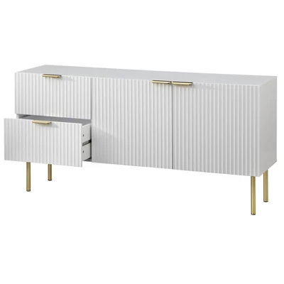 Elevate the aesthetic of your dining space with the Valen 60″ Wide Sideboard Buffet by Lifestorey. Mid-century design inspired, this sideboard features gold metal handles and legs that complement the white finish. Texture and dimension accentuate the distinctive grooved channel door front design. Behind each cabinet door resides an adjustable shelf to store various sized serving pieces, decorative items, and dishware, while two spacious drawers are ideal for linens, flatware, and entertaining accessories. Perfect for your dining room or as a cabinet in your living room.